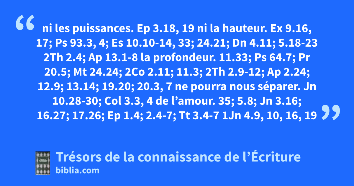 ni les puissances. Ep 3.18, 19 ni la hauteur. Ex 9.16, 17; Ps 93.3, 4; Es 10.10-14, 33; 24.21; Dn 4.11; 5.18-23 2Th 2.4; Ap 13.1-8 la profondeur. 11.33; Ps 64.7; Pr 20.5; Mt 24.24; 2Co 2.11; 11.3; 2Th 2.9-12; Ap 2.24; 12.9; 13.14; 19.20; 20.3, 7 ne pourra nous séparer. Jn 10.28-30; Col 3.3, 4 de l’amour. 35; 5.8; Jn 3.16; 16.27; 17.26; Ep 1.4; 2.4-7; Tt 3.4-7 1Jn 4.9, 10, 16, 19