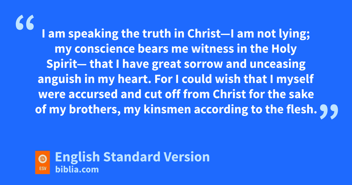 9 aI am speaking the truth in Christ—I am not lying; my conscience bears me witness in the Holy Spirit— 2 that I have great sorrow and unceasing anguish in my heart. 3 For bI could wish that I myself were caccursed and cut off from Christ for the sake of my brothers,1 my kinsmen daccording to the flesh. 4 They are eIsraelites, and to them belong fthe adoption, gthe glory, hthe covenants, ithe giving of the law, jthe worship, and kthe promises. 5 To them belong lthe patriarchs, and from their race, according to the flesh, is the Christ, mwho is God over all, nblessed forever. Amen.