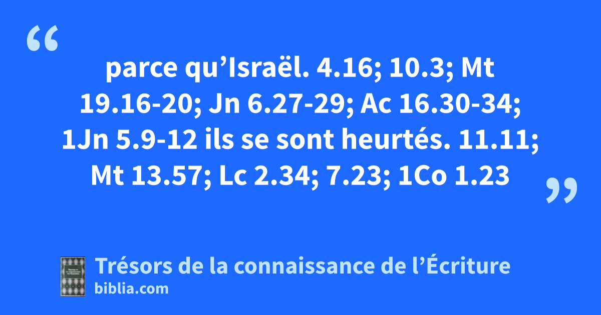 parce qu’Israël. 4.16; 10.3; Mt 19.16-20; Jn 6.27-29; Ac 16.30-34; 1Jn 5.9-12 ils se sont heurtés. 11.11; Mt 13.57; Lc 2.34; 7.23; 1Co 1.23