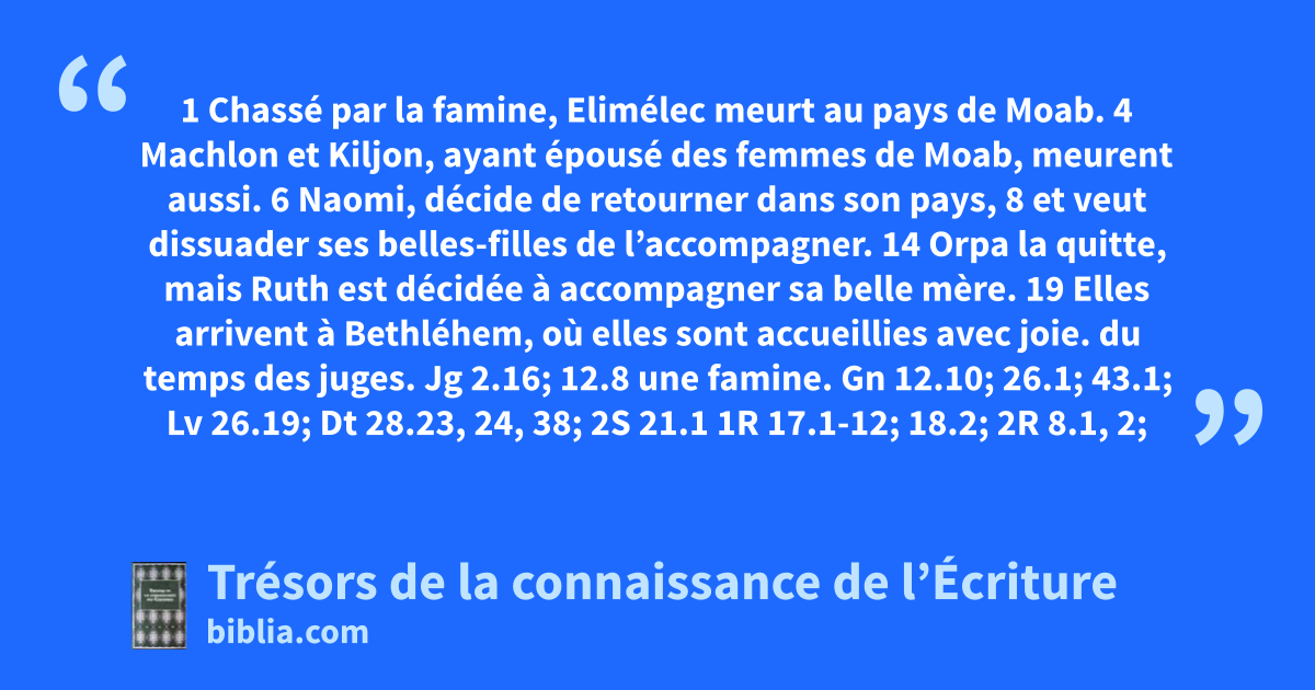 1 Chassé par la famine, Elimélec meurt au pays de Moab. 4 Machlon et Kiljon, ayant épousé des femmes de Moab, meurent aussi. 6 Naomi, décide de retourner dans son pays, 8 et veut dissuader ses belles-filles de l’accompagner. 14 Orpa la quitte, mais Ruth est décidée à accompagner sa belle mère. 19 Elles arrivent à Bethléhem, où elles sont accueillies avec joie.