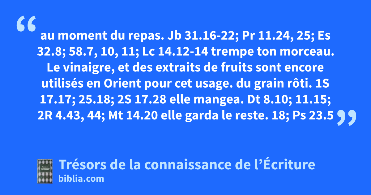 au moment du repas. Jb 31.16-22; Pr 11.24, 25; Es 32.8; 58.7, 10, 11; Lc 14.12-14 trempe ton morceau. Le vinaigre, et des extraits de fruits sont encore utilisés en Orient pour cet usage. du grain rôti. 1S 17.17; 25.18; 2S 17.28 elle mangea. Dt 8.10; 11.15; 2R 4.43, 44; Mt 14.20 elle garda le reste. 18; Ps 23.5