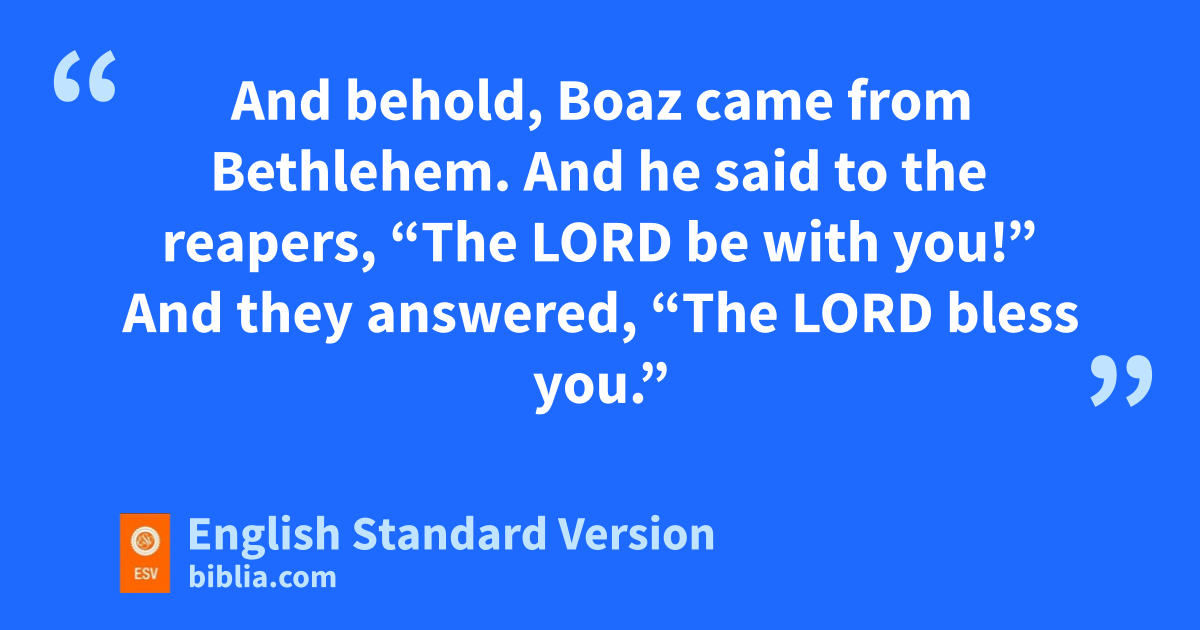 2 Now Naomi had ta relative of her husband’s, a worthy man of the clan of Elimelech, whose name was uBoaz. 2 And Ruth the Moabite said to Naomi, “Let me go to the field and vglean among the ears of grain after him win whose sight I shall find favor.” And she said to her, “Go, my daughter.” 3 So she set out and went and gleaned in the field after the reapers, and she happened to come to the part of the field belonging to Boaz, who was of the clan of Elimelech. 4 And behold, Boaz came from Bethlehem. And he said to the reapers, x“The Lord be with you!” And they answered, “The Lord bless you.” 5 Then Boaz said to his young man who was in charge of the reapers, “Whose young woman is this?” 6 And the servant who was in charge of the reapers answered, “She is the young Moabite woman, ywho came back with Naomi from the country of Moab. 7 She said, ‘Please let me glean and gather among the sheaves after the reapers.’ So she came, and she has continued from early morning until now, except for a short rest.”1