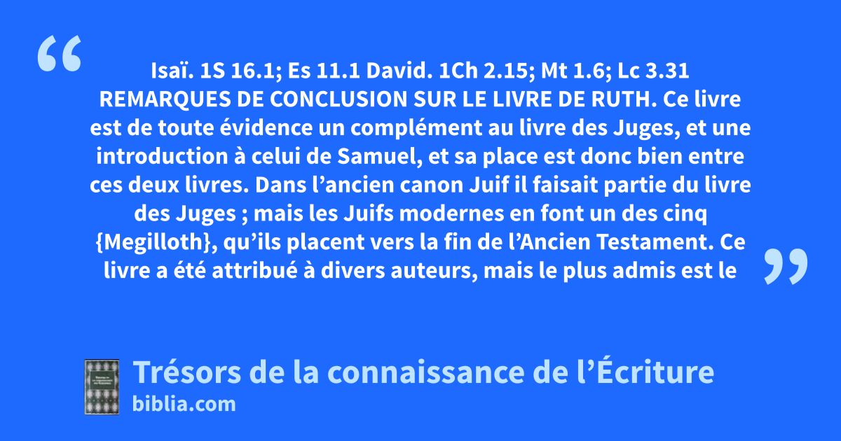 Ce livre est de toute évidence un complément au livre des Juges, et une introduction à celui de Samuel, et sa place est donc bien entre ces deux livres. Dans l’ancien canon Juif il faisait partie du livre des Juges ; mais les Juifs modernes en font un des cinq {Megilloth}, qu’ils placent vers la fin de l’Ancien Testament. Ce livre a été attribué à divers auteurs, mais le plus admis est le prophète Samuel, car avant son époque la généalogie qui figure au chapitre 4, versets 17 à 22, n’aurait pu être écrite. La période couverte par les événements décrits dans Ruth est incertaine. Augustin la rattache au gouvernement royal des Hébreux, Josèphe à l’administration d’Éli ; d’autres à l’époque d’Ehud, ou d’Ibtsan ; ou de Gédéon, etc. L’authenticité de ce livre sacré ne peut être mise en question, et les Évangélistes ont utilisé ses références généalogiques pour exposer la généalogie de Christ. Il a été prédit que le Messie serait de la tribu de Juda, puis qu’il serait de la famille de David, et il fallait donc pour qu’il n’y ait aucune suspicion de fraude ou de dessein, que l’histoire de cette famille fut écrite avant que les prophéties ne soient révélées. Toute l’histoire est intéressante et instructive, et écrite avec la plus grande simplicité. La détresse de Naomi, son affection pour ses belles-filles, le départ d’Orpa, l’attachement de Ruth, le triste retour à Bethléhem, sont racontés d’une manière attachante. La simplicité des manières, le récit du travail de Ruth, l’attention de Naomi, la charité élégante de Boaz et sa connaissance de ses devoirs envers Ruth forment un contraste plaisant avec les scènes agitées décrites dans le livre précédent. Nous trouvons là, d’une manière frappante et affectueuse, le soin que prend la divine providence à ceux qui craignent Dieu, et qui veulent honnêtement faire sa volonté. Le fait qu’une Moabite soit une des ancêtres de Christ semble préfigurer l’admission des nations païennes, des Gentils, dans l’Église. Il doit être fait la remarque qu’aux yeux des Juifs il était regrettable que David soit le descendant d’une Moabite, et l’on peut supposer que Schimeï, dans ses luttes contre lui voulait en partie insulter cette descendance de Ruth. Dans ce livre véridique de nombreuses circonstances montrent qu’elles ne peuvent être le fruit de l’imagination.