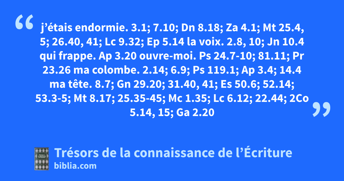 j’étais endormie. 3.1; 7.10; Dn 8.18; Za 4.1; Mt 25.4, 5; 26.40, 41; Lc 9.32; Ep 5.14 la voix. 2.8, 10; Jn 10.4 qui frappe. Ap 3.20 ouvre-moi. Ps 24.7-10; 81.11; Pr 23.26 ma colombe. 2.14; 6.9; Ps 119.1; Ap 3.4; 14.4 ma tête. 8.7; Gn 29.20; 31.40, 41; Es 50.6; 52.14; 53.3-5; Mt 8.17; 25.35-45; Mc 1.35; Lc 6.12; 22.44; 2Co 5.14, 15; Ga 2.20