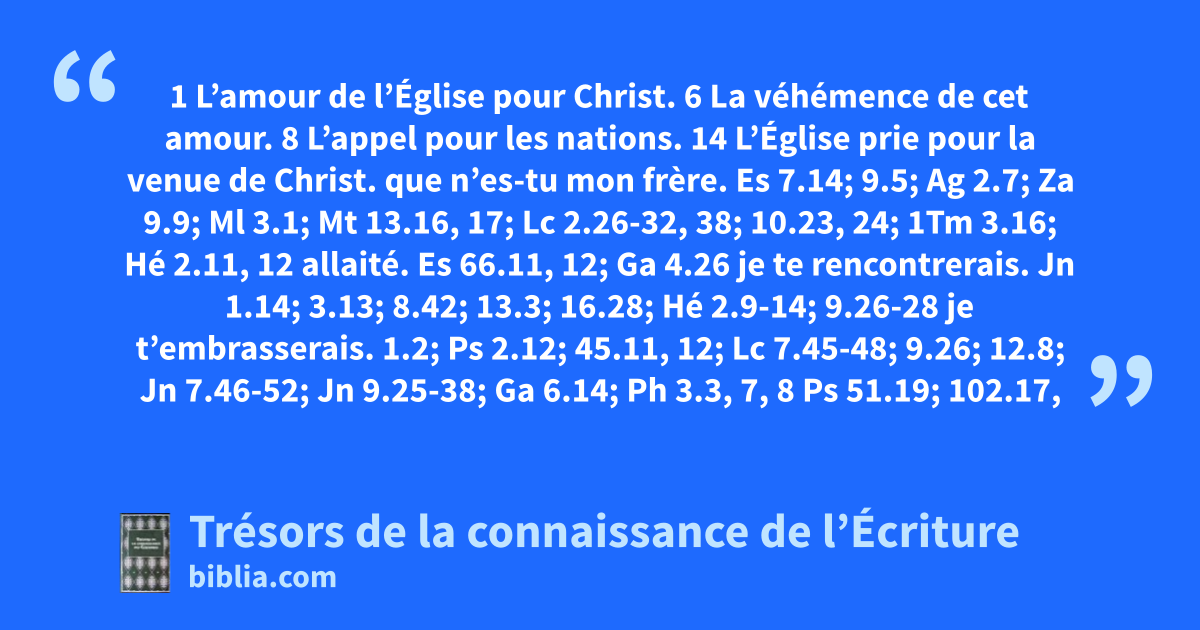 1 L’amour de l’Église pour Christ. 6 La véhémence de cet amour. 8 L’appel pour les nations. 14 L’Église prie pour la venue de Christ.