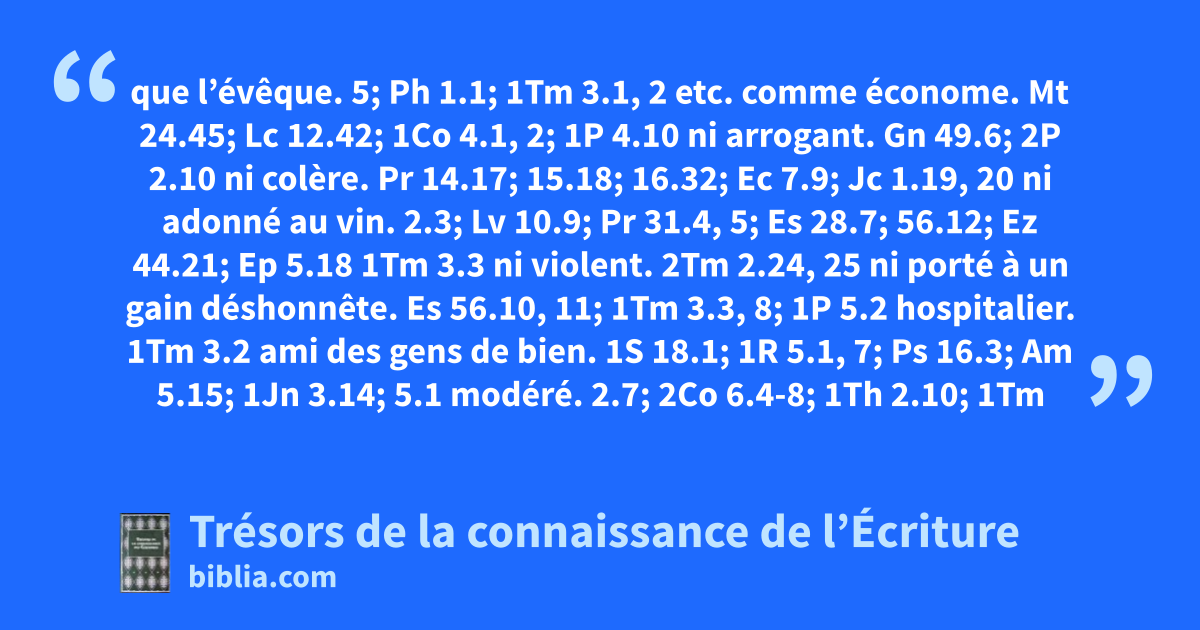 que l’évêque. 5; Ph 1.1; 1Tm 3.1, 2 etc. comme économe. Mt 24.45; Lc 12.42; 1Co 4.1, 2; 1P 4.10 ni arrogant. Gn 49.6; 2P 2.10 ni colère. Pr 14.17; 15.18; 16.32; Ec 7.9; Jc 1.19, 20 ni adonné au vin. 2.3; Lv 10.9; Pr 31.4, 5; Es 28.7; 56.12; Ez 44.21; Ep 5.18 1Tm 3.3 ni violent. 2Tm 2.24, 25 ni porté à un gain déshonnête. Es 56.10, 11; 1Tm 3.3, 8; 1P 5.2