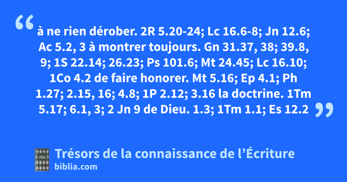 à ne rien dérober. 2R 5.20-24; Lc 16.6-8; Jn 12.6; Ac 5.2, 3 à montrer toujours. Gn 31.37, 38; 39.8, 9; 1S 22.14; 26.23; Ps 101.6; Mt 24.45; Lc 16.10; 1Co 4.2 de faire honorer. Mt 5.16; Ep 4.1; Ph 1.27; 2.15, 16; 4.8; 1P 2.12; 3.16 la doctrine. 1Tm 5.17; 6.1, 3; 2 Jn 9 de Dieu. 1.3; 1Tm 1.1; Es 12.2