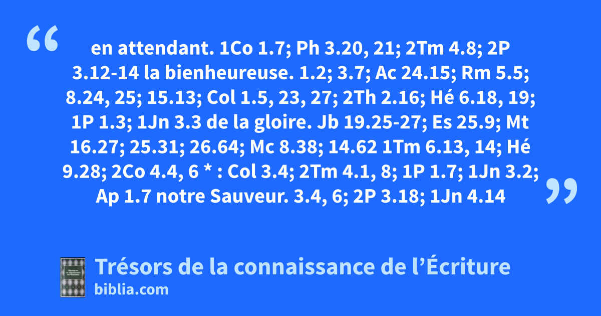 en attendant. 1Co 1.7; Ph 3.20, 21; 2Tm 4.8; 2P 3.12-14 la bienheureuse. 1.2; 3.7; Ac 24.15; Rm 5.5; 8.24, 25; 15.13; Col 1.5, 23, 27; 2Th 2.16; Hé 6.18, 19; 1P 1.3; 1Jn 3.3 de la gloire. Jb 19.25-27; Es 25.9; Mt 16.27; 25.31; 26.64; Mc 8.38; 14.62 1Tm 6.13, 14; Hé 9.28; 2Co 4.4, 6 * : Col 3.4; 2Tm 4.1, 8; 1P 1.7; 1Jn 3.2; Ap 1.7 notre Sauveur. 3.4, 6; 2P 3.18; 1Jn 4.14