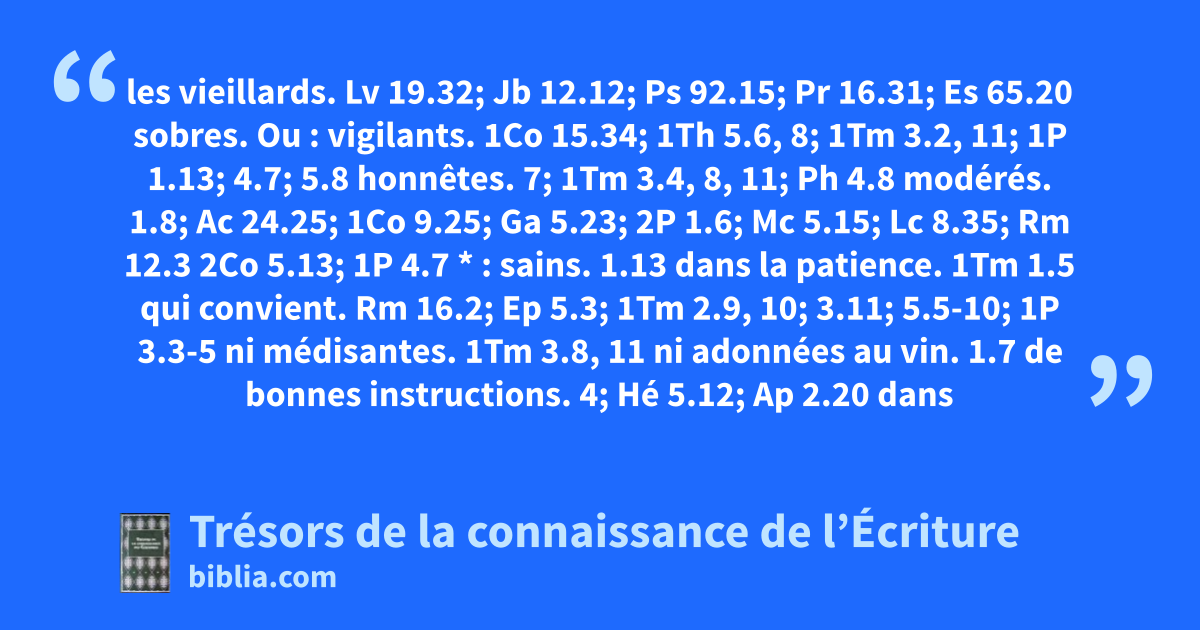 les vieillards. Lv 19.32; Jb 12.12; Ps 92.15; Pr 16.31; Es 65.20 sobres. Ou : vigilants. 1Co 15.34; 1Th 5.6, 8; 1Tm 3.2, 11; 1P 1.13; 4.7; 5.8 honnêtes. 7; 1Tm 3.4, 8, 11; Ph 4.8 modérés. 1.8; Ac 24.25; 1Co 9.25; Ga 5.23; 2P 1.6; Mc 5.15; Lc 8.35; Rm 12.3 2Co 5.13; 1P 4.7 * : sains. 1.13 dans la patience. 1Tm 1.5