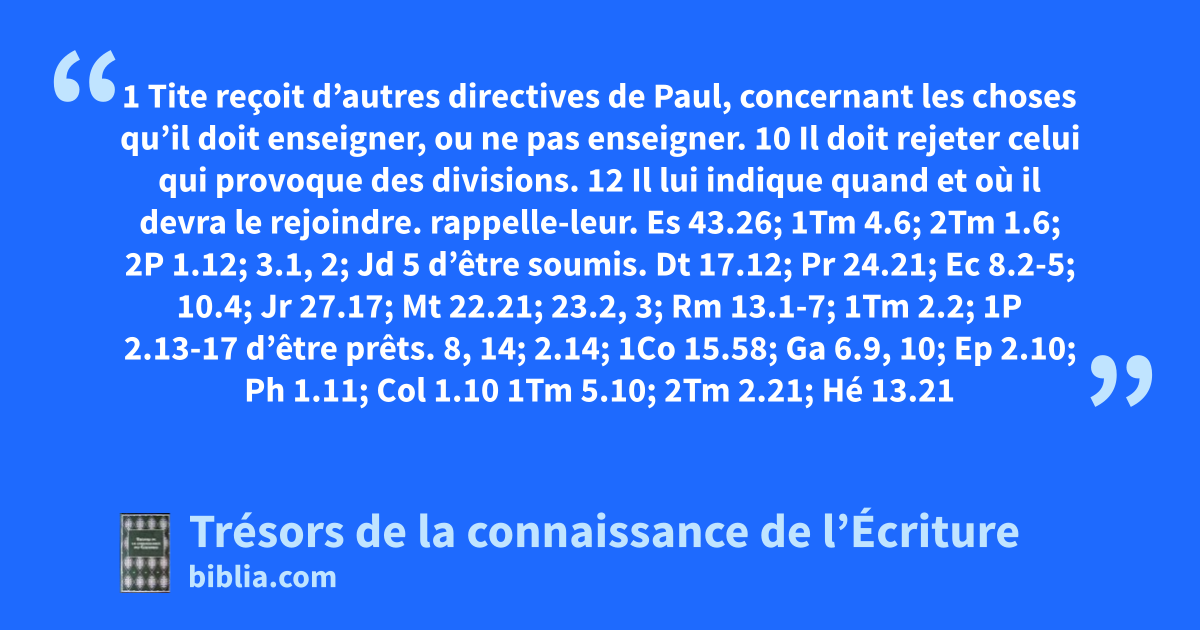 rappelle-leur. Es 43.26; 1Tm 4.6; 2Tm 1.6; 2P 1.12; 3.1, 2; Jd 5 d’être soumis. Dt 17.12; Pr 24.21; Ec 8.2-5; 10.4; Jr 27.17; Mt 22.21; 23.2, 3; Rm 13.1-7; 1Tm 2.2; 1P 2.13-17 d’être prêts. 8, 14; 2.14; 1Co 15.58; Ga 6.9, 10; Ep 2.10; Ph 1.11; Col 1.10 1Tm 5.10; 2Tm 2.21; Hé 13.21