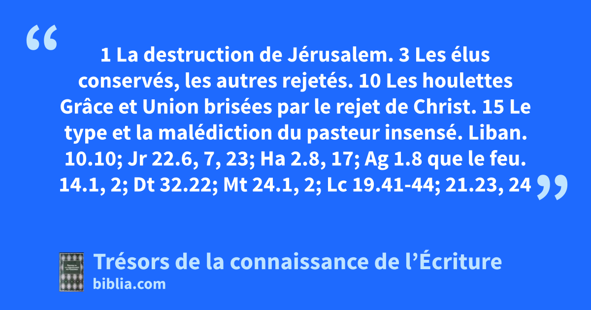 1 La destruction de Jérusalem. 3 Les élus conservés, les autres rejetés. 10 Les houlettes Grâce et Union brisées par le rejet de Christ. 15 Le type et la malédiction du pasteur insensé.