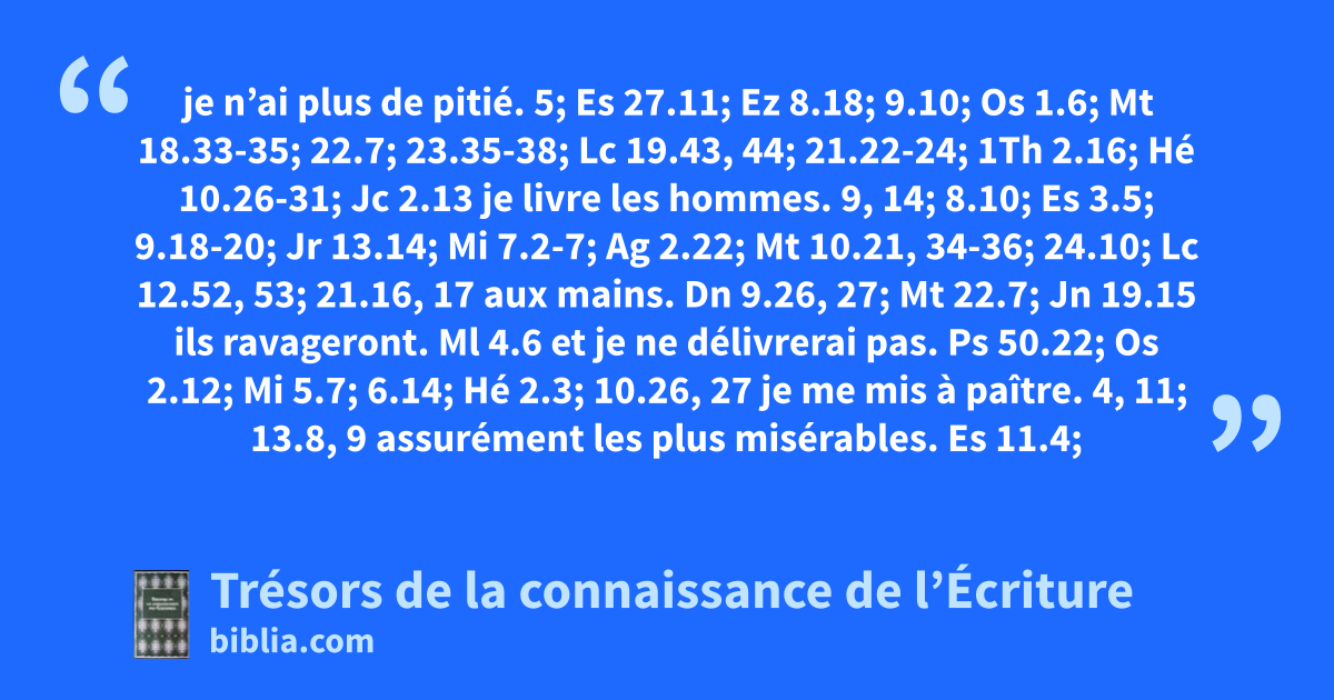 je n’ai plus de pitié. 5; Es 27.11; Ez 8.18; 9.10; Os 1.6; Mt 18.33-35; 22.7; 23.35-38; Lc 19.43, 44; 21.22-24; 1Th 2.16; Hé 10.26-31; Jc 2.13 je livre les hommes. 9, 14; 8.10; Es 3.5; 9.18-20; Jr 13.14; Mi 7.2-7; Ag 2.22; Mt 10.21, 34-36; 24.10; Lc 12.52, 53; 21.16, 17 aux mains. Dn 9.26, 27; Mt 22.7; Jn 19.15 ils ravageront. Ml 4.6 et je ne délivrerai pas. Ps 50.22; Os 2.12; Mi 5.7; 6.14; Hé 2.3; 10.26, 27