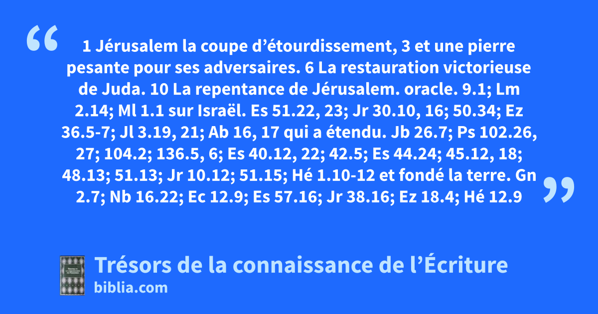 oracle. 9.1; Lm 2.14; Ml 1.1 sur Israël. Es 51.22, 23; Jr 30.10, 16; 50.34; Ez 36.5-7; Jl 3.19, 21; Ab 16, 17 qui a étendu. Jb 26.7; Ps 102.26, 27; 104.2; 136.5, 6; Es 40.12, 22; 42.5; Es 44.24; 45.12, 18; 48.13; 51.13; Jr 10.12; 51.15; Hé 1.10-12 et fondé la terre. Gn 2.7; Nb 16.22; Ec 12.9; Es 57.16; Jr 38.16; Ez 18.4; Hé 12.9
