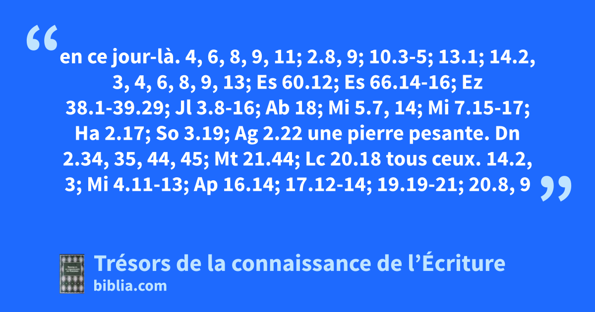 en ce jour-là. 4, 6, 8, 9, 11; 2.8, 9; 10.3-5; 13.1; 14.2, 3, 4, 6, 8, 9, 13; Es 60.12; Es 66.14-16; Ez 38.1-39.29; Jl 3.8-16; Ab 18; Mi 5.7, 14; Mi 7.15-17; Ha 2.17; So 3.19; Ag 2.22 une pierre pesante. Dn 2.34, 35, 44, 45; Mt 21.44; Lc 20.18 tous ceux. 14.2, 3; Mi 4.11-13; Ap 16.14; 17.12-14; 19.19-21; 20.8, 9