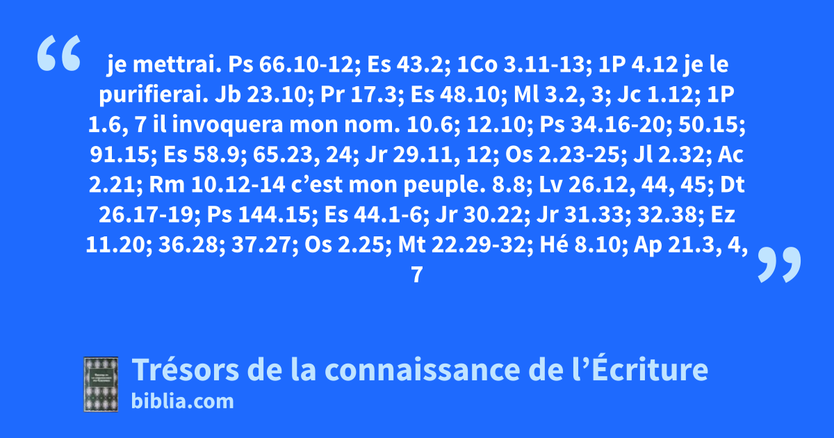 je mettrai. Ps 66.10-12; Es 43.2; 1Co 3.11-13; 1P 4.12 je le purifierai. Jb 23.10; Pr 17.3; Es 48.10; Ml 3.2, 3; Jc 1.12; 1P 1.6, 7 il invoquera mon nom. 10.6; 12.10; Ps 34.16-20; 50.15; 91.15; Es 58.9; 65.23, 24; Jr 29.11, 12; Os 2.23-25; Jl 2.32; Ac 2.21; Rm 10.12-14 c’est mon peuple. 8.8; Lv 26.12, 44, 45; Dt 26.17-19; Ps 144.15; Es 44.1-6; Jr 30.22; Jr 31.33; 32.38; Ez 11.20; 36.28; 37.27; Os 2.25; Mt 22.29-32; Hé 8.10; Ap 21.3, 4, 7