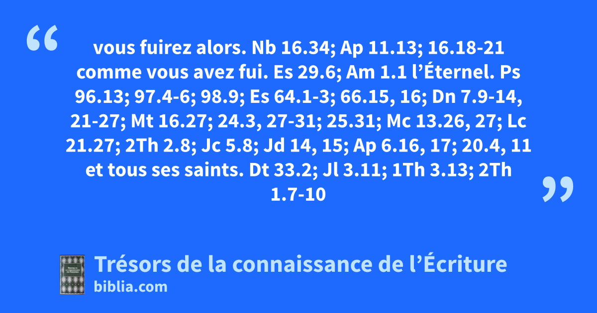 vous fuirez alors. Nb 16.34; Ap 11.13; 16.18-21 comme vous avez fui. Es 29.6; Am 1.1 l’Éternel. Ps 96.13; 97.4-6; 98.9; Es 64.1-3; 66.15, 16; Dn 7.9-14, 21-27; Mt 16.27; 24.3, 27-31; 25.31; Mc 13.26, 27; Lc 21.27; 2Th 2.8; Jc 5.8; Jd 14, 15; Ap 6.16, 17; 20.4, 11 et tous ses saints. Dt 33.2; Jl 3.11; 1Th 3.13; 2Th 1.7-10