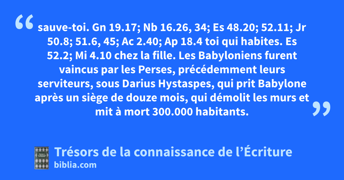 sauve-toi. Gn 19.17; Nb 16.26, 34; Es 48.20; 52.11; Jr 50.8; 51.6, 45; Ac 2.40; Ap 18.4 toi qui habites. Es 52.2; Mi 4.10 chez la fille. Les Babyloniens furent vaincus par les Perses, précédemment leurs serviteurs, sous Darius Hystaspes, qui prit Babylone après un siège de douze mois, qui démolit les murs et mit à mort 300.000 habitants.