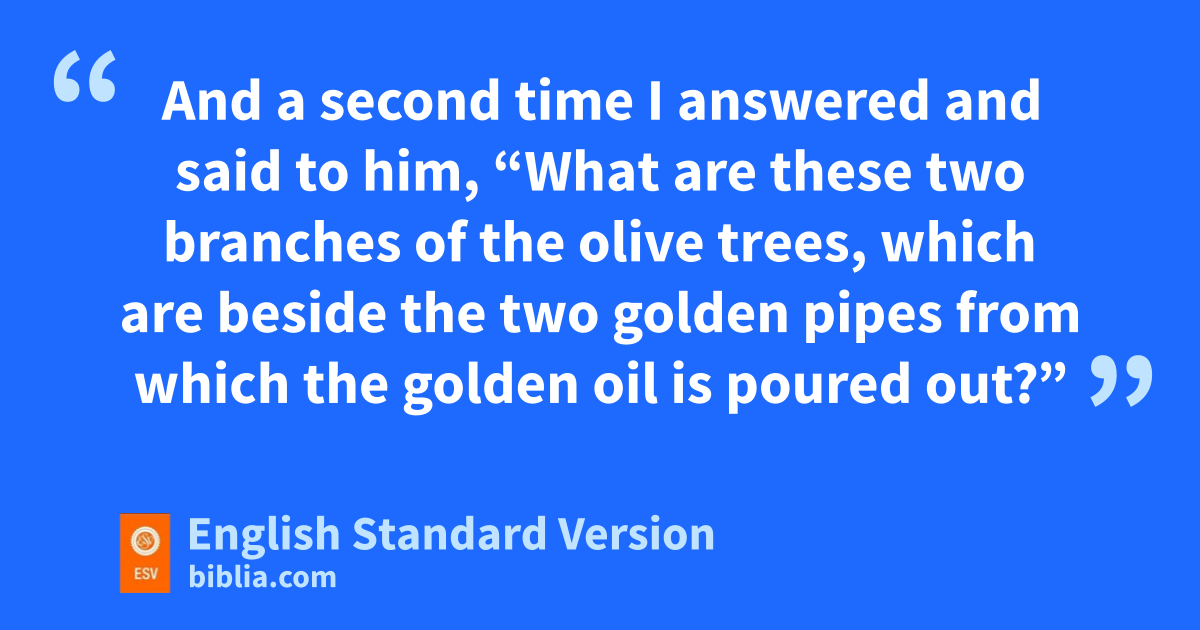 v“These seven vare the eyes of the Lord, wwhich range through the whole earth.” 11 Then I said to him, “What are these jtwo olive trees on the right and the left of the lampstand?” 12 And a second time I answered and said to him, “What are these jtwo branches of the olive trees, which are beside the two golden pipes from which the golden oil1 is poured out?” 13 He said to me, x“Do you not know what these are?” I said, “No, my lord.” 14 Then he said, y“These are the two anointed ones2 who stand by zthe Lord of the whole earth.”