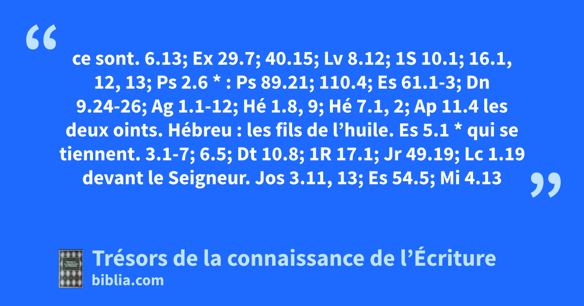 ce sont. 6.13; Ex 29.7; 40.15; Lv 8.12; 1S 10.1; 16.1, 12, 13; Ps 2.6 * : Ps 89.21; 110.4; Es 61.1-3; Dn 9.24-26; Ag 1.1-12; Hé 1.8, 9; Hé 7.1, 2; Ap 11.4 les deux oints. Hébreu : les fils de l’huile. Es 5.1 * qui se tiennent. 3.1-7; 6.5; Dt 10.8; 1R 17.1; Jr 49.19; Lc 1.19 devant le Seigneur. Jos 3.11, 13; Es 54.5; Mi 4.13