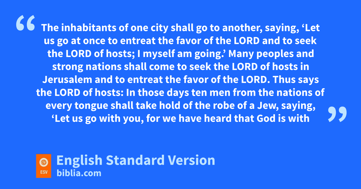 20 “Thus says the Lord of hosts: Peoples shall yet come, even the inhabitants of many cities. 21 The inhabitants of one city shall go to another, saying, b‘Let us go at once cto entreat the favor of the Lord and to seek the Lord of hosts; I myself am going.’ 22 bMany peoples and strong nations shall come to seek the Lord of hosts in Jerusalem and cto entreat the favor of the Lord. 23 Thus says the Lord of hosts: In those days dten men efrom the nations of every tongue shall take hold of the robe of a Jew, saying, ‘Let us go with you, for fwe have heard that God is with you.’ ”