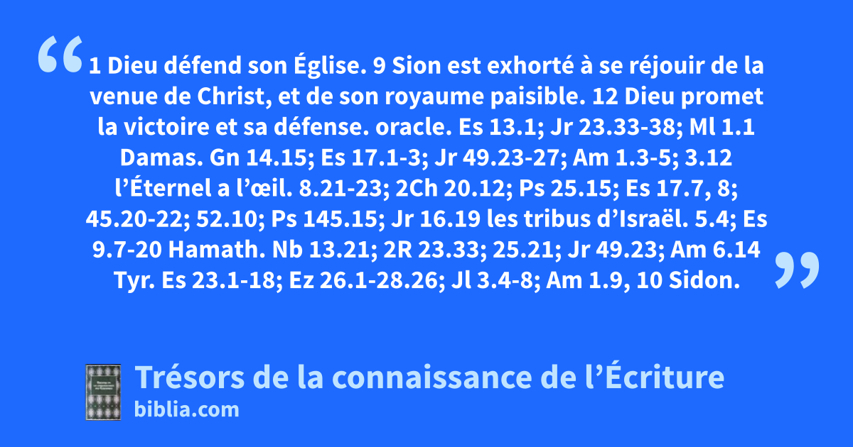 1 Dieu défend son Église. 9 Sion est exhorté à se réjouir de la venue de Christ, et de son royaume paisible. 12 Dieu promet la victoire et sa défense.