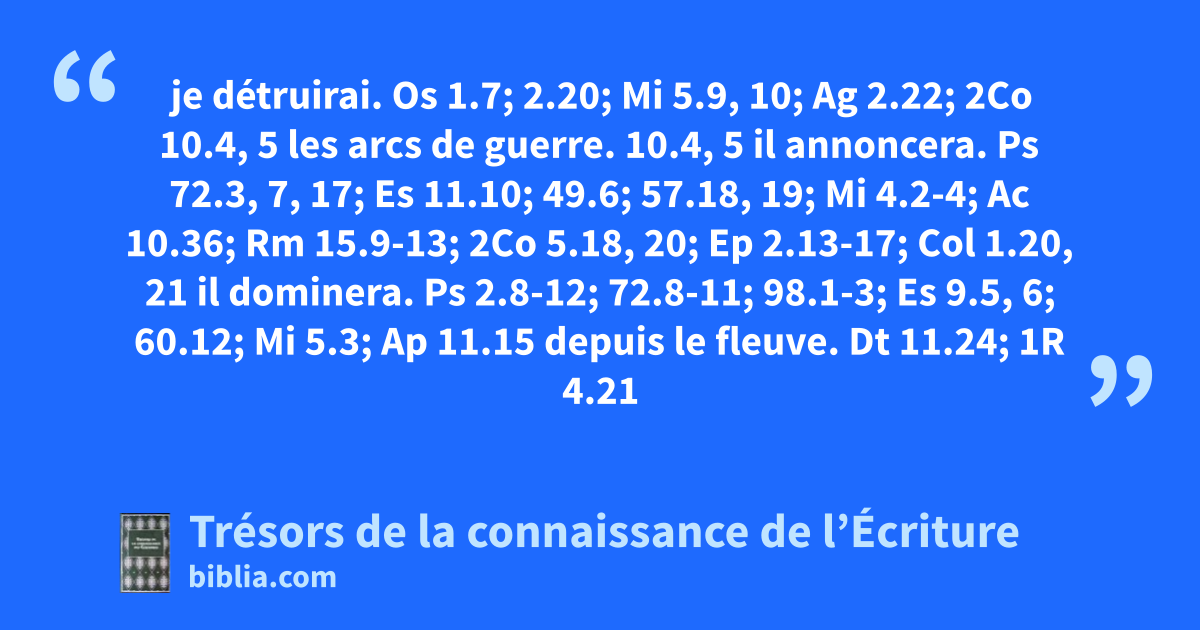 je détruirai. Os 1.7; 2.20; Mi 5.9, 10; Ag 2.22; 2Co 10.4, 5 les arcs de guerre. 10.4, 5 il annoncera. Ps 72.3, 7, 17; Es 11.10; 49.6; 57.18, 19; Mi 4.2-4; Ac 10.36; Rm 15.9-13; 2Co 5.18, 20; Ep 2.13-17; Col 1.20, 21 il dominera. Ps 2.8-12; 72.8-11; 98.1-3; Es 9.5, 6; 60.12; Mi 5.3; Ap 11.15 depuis le fleuve. Dt 11.24; 1R 4.21