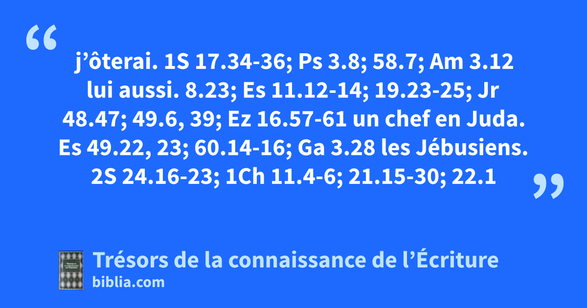 j’ôterai. 1S 17.34-36; Ps 3.8; 58.7; Am 3.12 lui aussi. 8.23; Es 11.12-14; 19.23-25; Jr 48.47; 49.6, 39; Ez 16.57-61 un chef en Juda. Es 49.22, 23; 60.14-16; Ga 3.28 les Jébusiens. 2S 24.16-23; 1Ch 11.4-6; 21.15-30; 22.1