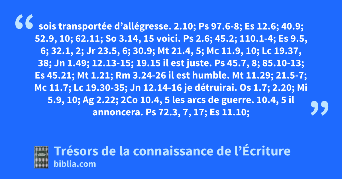sois transportée d’allégresse. 2.10; Ps 97.6-8; Es 12.6; 40.9; 52.9, 10; 62.11; So 3.14, 15 voici. Ps 2.6; 45.2; 110.1-4; Es 9.5, 6; 32.1, 2; Jr 23.5, 6; 30.9; Mt 21.4, 5; Mc 11.9, 10; Lc 19.37, 38; Jn 1.49; 12.13-15; 19.15 il est juste. Ps 45.7, 8; 85.10-13; Es 45.21; Mt 1.21; Rm 3.24-26 il est humble. Mt 11.29; 21.5-7; Mc 11.7; Lc 19.30-35; Jn 12.14-16