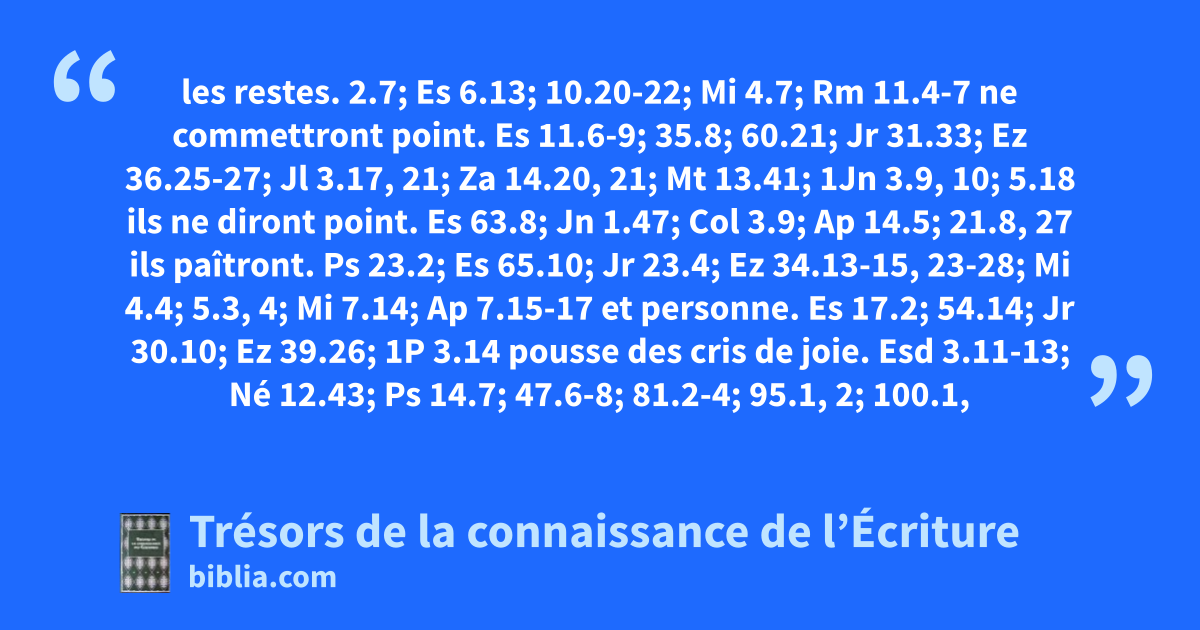 les restes. 2.7; Es 6.13; 10.20-22; Mi 4.7; Rm 11.4-7 ne commettront point. Es 11.6-9; 35.8; 60.21; Jr 31.33; Ez 36.25-27; Jl 3.17, 21; Za 14.20, 21; Mt 13.41; 1Jn 3.9, 10; 5.18 ils ne diront point. Es 63.8; Jn 1.47; Col 3.9; Ap 14.5; 21.8, 27 ils paîtront. Ps 23.2; Es 65.10; Jr 23.4; Ez 34.13-15, 23-28; Mi 4.4; 5.3, 4; Mi 7.14; Ap 7.15-17 et personne. Es 17.2; 54.14; Jr 30.10; Ez 39.26; 1P 3.14