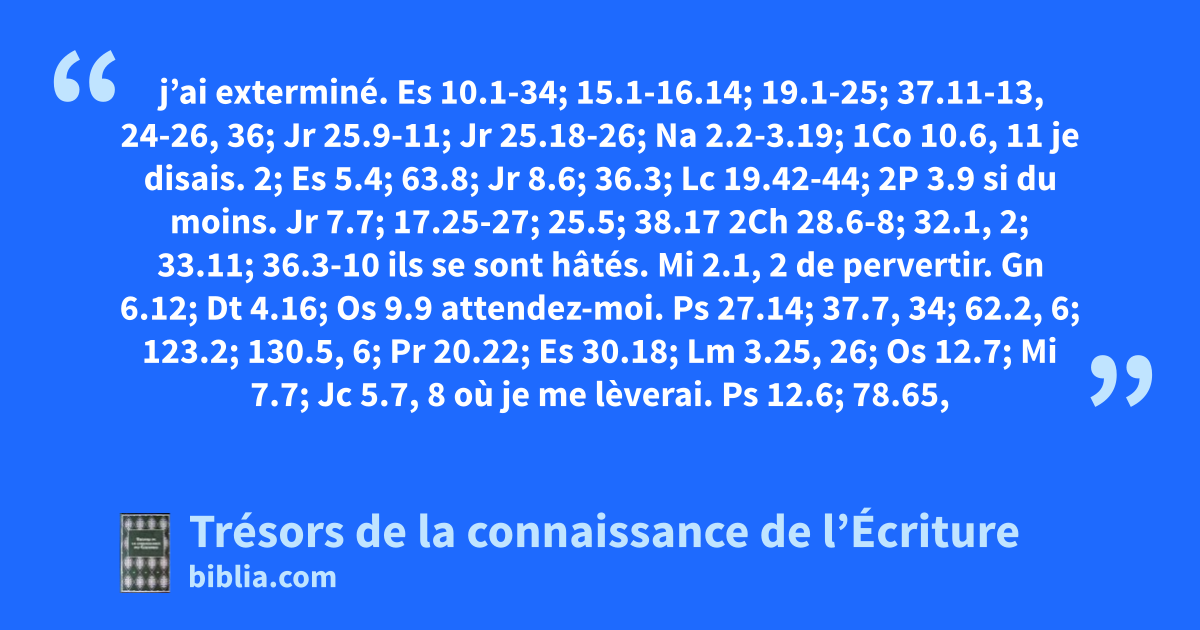 j’ai exterminé. Es 10.1-34; 15.1-16.14; 19.1-25; 37.11-13, 24-26, 36; Jr 25.9-11; Jr 25.18-26; Na 2.2-3.19; 1Co 10.6, 11