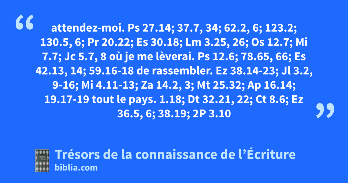 attendez-moi. Ps 27.14; 37.7, 34; 62.2, 6; 123.2; 130.5, 6; Pr 20.22; Es 30.18; Lm 3.25, 26; Os 12.7; Mi 7.7; Jc 5.7, 8 où je me lèverai. Ps 12.6; 78.65, 66; Es 42.13, 14; 59.16-18 de rassembler. Ez 38.14-23; Jl 3.2, 9-16; Mi 4.11-13; Za 14.2, 3; Mt 25.32; Ap 16.14; 19.17-19 tout le pays. 1.18; Dt 32.21, 22; Ct 8.6; Ez 36.5, 6; 38.19; 2P 3.10